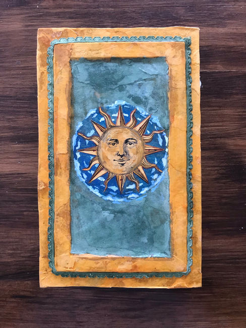 Le papier utilisé est un papier cartonné lisse, adapté à de nombreux médiums (encre, graphite, aquarelle, craie, peinture, etc.). L’effet parchemin est obtenu grâce à un procédé minutieux : chaque feuille est déchirée à la main, une à une.